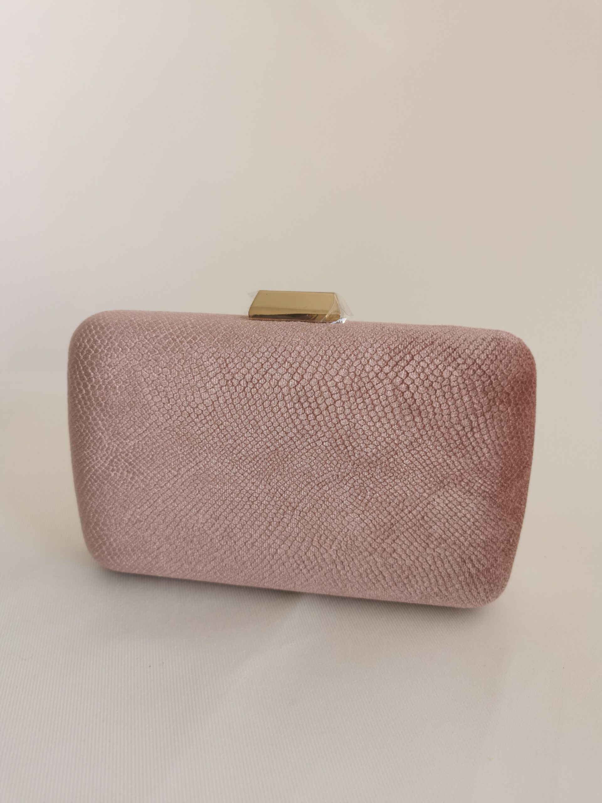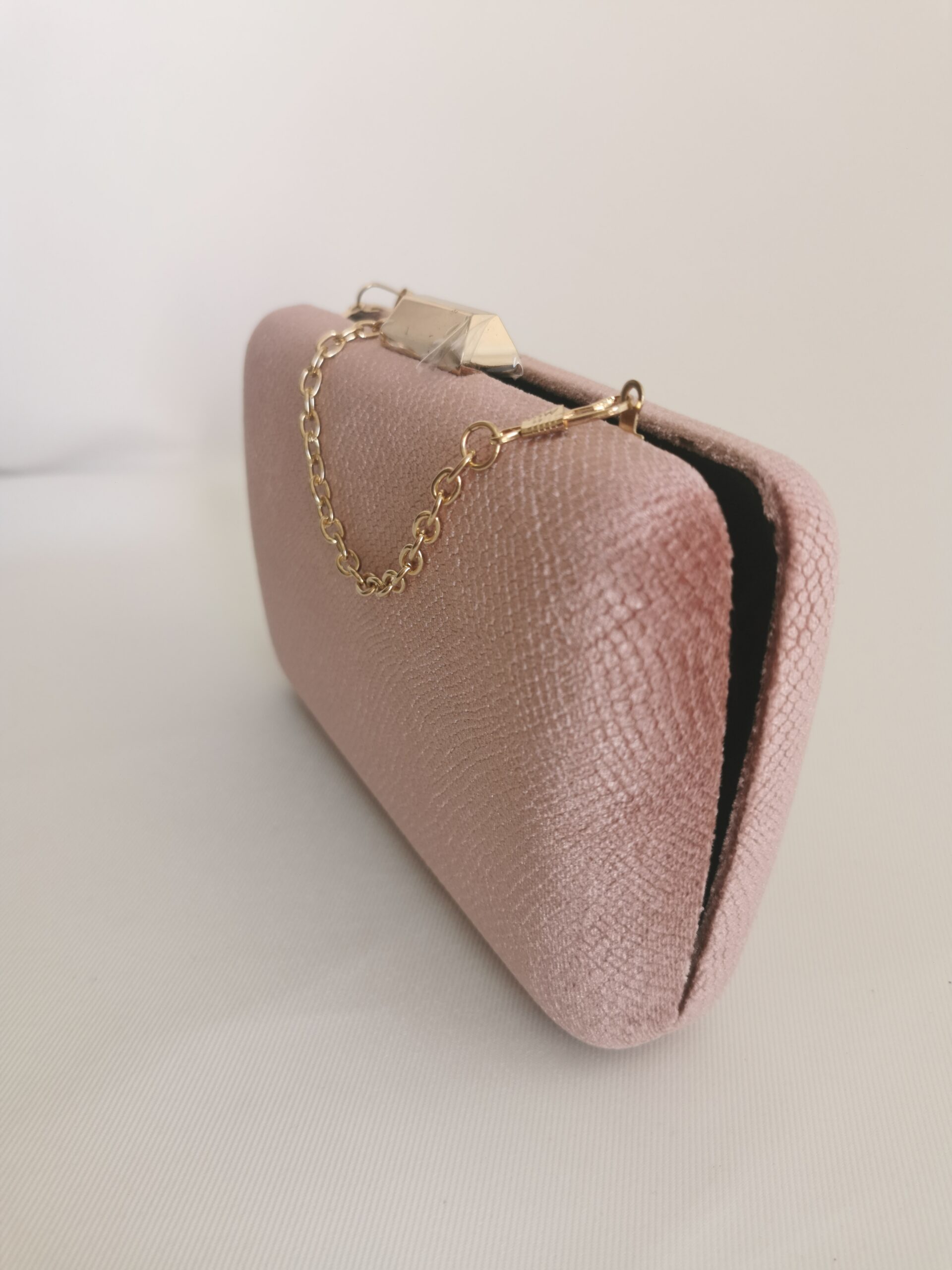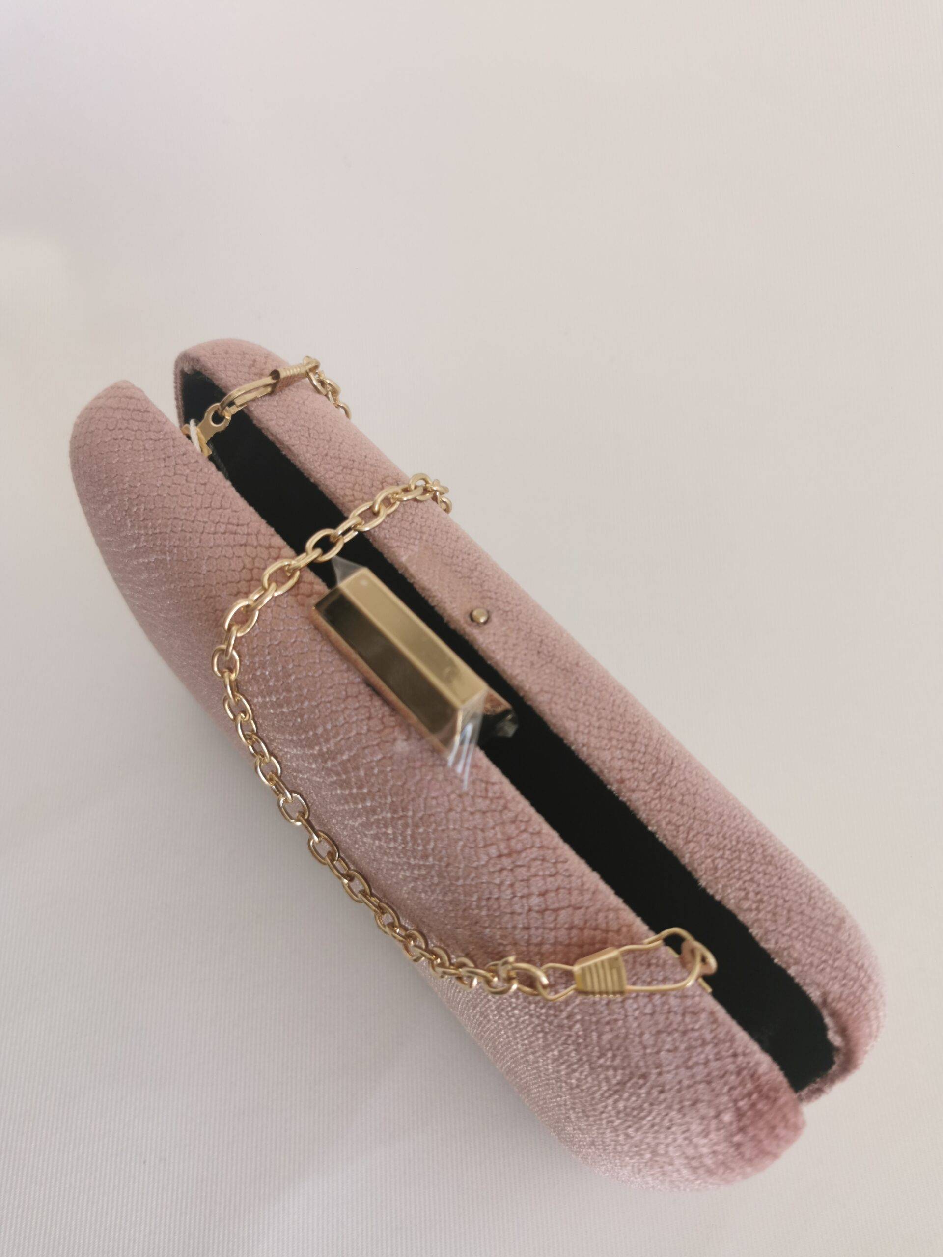 Bolso de mano de color rosa palo, tamaño 13cmx19cmx3cm, con cadena de hombro de 121cm de largo en dorado, y cierre en dorado.